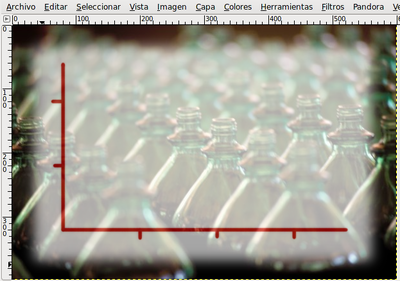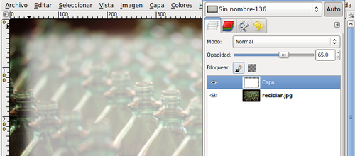 - Menú Seleccionar --> Invertir, la parte seleccionada pasa a ser la exterior al rectángulo redondeado. Ahora con el botón derecho del ratón elige Editar --> Limpiar (Supr) y quita la selección para poder seguir trabajando en la imagen, para ello elige Seleccionar --> Ninguno. Vas a hacer transparente la capa "fondo blanco" para que puedas ver la imagen de las botellas a través de esta capa. Aplica una opacidad de 65.