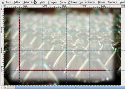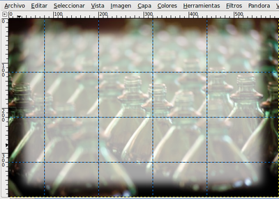 - Selecciona la herramienta Selección rectangular y en las Opciones de esta herramienta selecciona Difuminar los bordes con un radio de 30. En la Ventana imagen hacemos una selección rectangular sobre la nueva capa creada dejando un pequeño margen exterior, tal y como ves en la imagen.