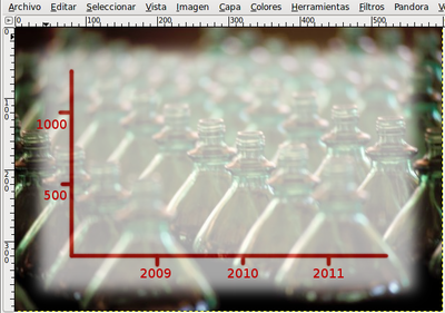 seleccionada en la Caja de herramientas, haz clic cerca de cada uno de los puntos en el eje de ordenadas y escribe "500" y "1000". Haz lo mismo con los puntos del eje de abscisas y escribe "2009", "2010" y "2011". El texto debe escribirse en el punto donde haces clic en la Ventana imagen, creándose una nueva capa con cada texto que escribas. No te preocupes si no entiendes muy bien las características de esta herramienta porque será tratada con profundidad en otro módulo.