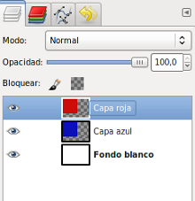 situado en la parte inferior de la ventana Capas y obtienes una nueva capa llamada "Copia de Capa azul". Renómbrala como "Capa roja" y rellénala de este color cc0d0a (rojo) de la misma forma que has rellenado la capa "Capa azul". Observa cómo queda la Ventana Capas tras rellenar de color rojo la nueva capa.