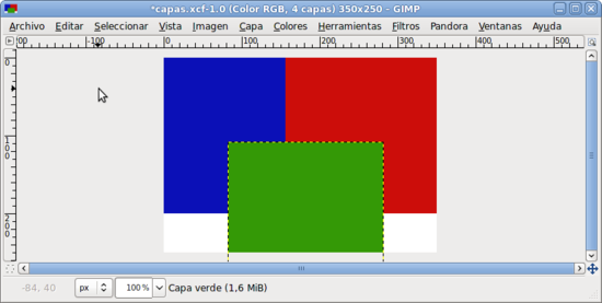 Observa, en la Ventana Imagen, que la nueva capa "Capa roja" oculta la "Capa azul". Por lo que vas a mover la "Capa roja" hacia la derecha. Antes de nada hay que comprobar que en la Ventana Capas tienes seleccionada la "Capa roja". Después elige la herramienta Mover