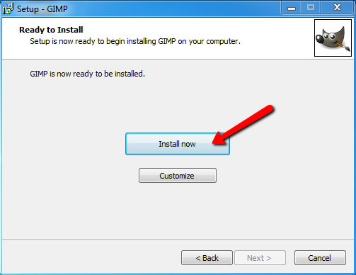 Comienza la instalación. Debes elegir Install now que instalará GIMP en un directorio prefijado; si utilizas la opción Customize te permitirá elegir la carpeta de instalación de GIMP. No te aconsejamos esta última opción porque nos puede dar algún problema en el futuro. Por lo tanto haz clic en Install now.