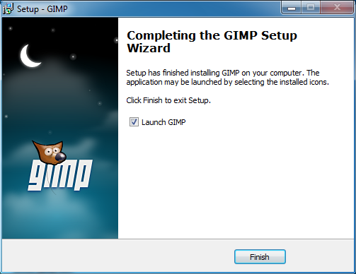Concluye la instalación. Queda marcada la opción Launch GIMP. Si haces clic en Finish concluye el proceso de instalación y se pone en marcha GIMP. Si dejas sin marcar la opción Launch GIMP concluirá el proceso de instalación y para poner en marcha GIMP debe ir a Inicio --> Todos los programas --> Gimp --> Gimp 2.