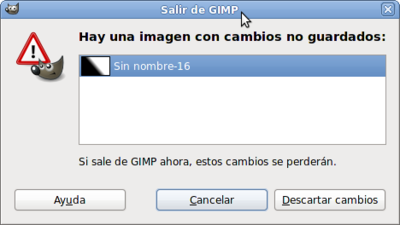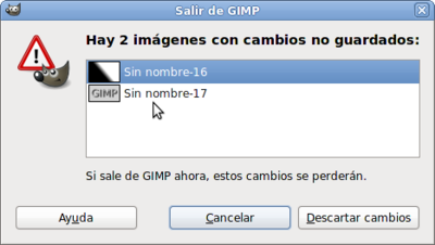 Te avisa de que tienes 2 imágenes con cambios que no han sido guardados. Si haces clic en Cancelar vuelves a GIMP para poder guardar las imágenes con los cambios realizados. Si, en cambio, haces clic en Descartar los cambios sales de GIMP sin guardar los cambios que hayas realizado en las imágenes mostradas en esta ventana.
