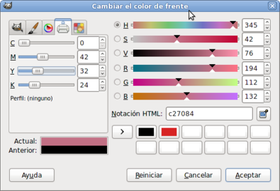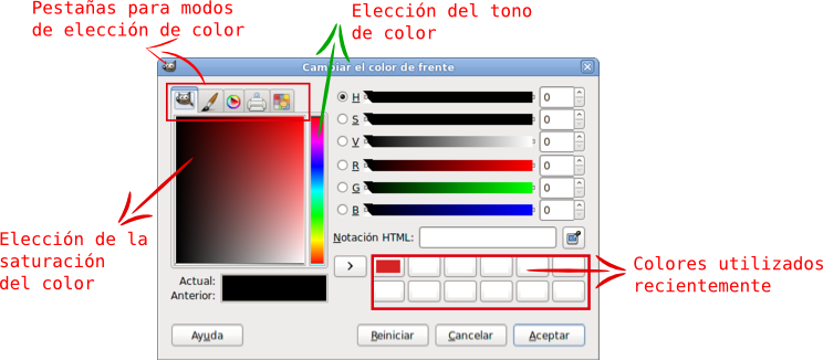 - En Actual, nos aparecerá el color seleccionado y en Anterior el color que teníamos seleccionado antes de entrar en la Ventana de selección de color de frente.