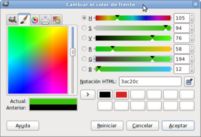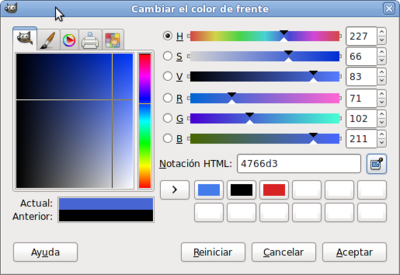 Ya hemos comentado que su funcionamiento es muy sencillo, primero seleccionamos un tono de color y después la saturación del color elegido. También podemos introducir el valor hexadecimal de un color determinado en la casilla correspondiente (Notación HTML). Escribe allí 4766d3 y pulsa Aceptar. Observa cómo ha cambiado el color de primer plano en la Caja de Herramientas.