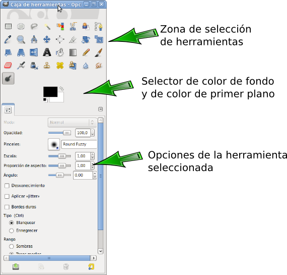 En primer lugar la zona donde podemos elegir la herramienta de GIMP con la que vamos a trabajar; para seleccionar cualquier herramienta únicamente debemos hacer clic sobre el icono correspondiente. Si mantenemos el puntero del ratón unos segundos sobre el icono de la herramienta nos aparece un texto de ayuda que nos indica el nombre de la herramienta y su utilidad.