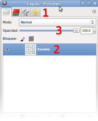 - Pestaña deslizante que permite modificar la opacidad de la capa sobre la que trabajemos. Por defecto tiene una opacidad completa (100 %).