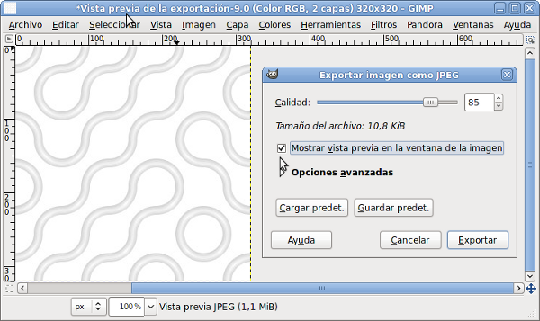 En la Ventana exportación encuentras distintos tipos de información y opciones. Si marcas Mostrar Vista Previa en la ventana de la imagen podrás ver cómo va variando el tamaño del archivo que contendrá la imagen a la vez que vas modificando los distintos parámetros. En nuestro caso no es necesario realizar ningún cambio, con lo que puedes pulsar Exportar