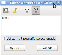 Ventana que aparece al utilizar la herramienta de Textos de GIMP y que permite escribir el texto a introducir en la imagen, cambiar el sentido de la introducción de texto y tiene la posibilidad de recuperar textos guardados en formato TXT.