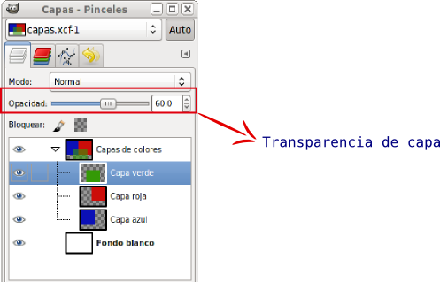 La transparencia de una capa determina cuanto deja pasar los colores de una capa a las que se encuentran debajo en la pila de capas. El valor 0 determina total transparencia y el 100, total opacidad.