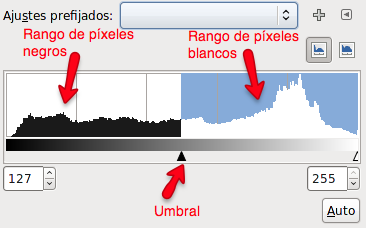 Esta herramienta transforma la capa activa, o una selección de ella, en una imagen blanca y negra donde los píxeles blancos representan los píxeles de la imagen cuyo valor está en el rango del umbral y los píxeles negros , el valor que está fuera de ese umbral.