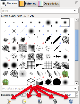 En la parte inferior de la pestaña Pinceles tienes una serie de iconos que permiten acceder a: Editar, Nuevo, Copiar, Borrar y Refrescar (para que aparezcan los nuevos pinceles creados).