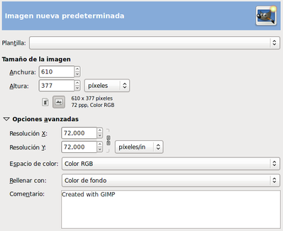 Puedes seleccionar desde el tamaño de la imagen, a la resolución, el tipo de imagen, el fondo que tendrá la imagen y el comentario que llevará añadida la imagen. Puedes partir de una plantilla a elegir entre las que tiene GIMP por defecto o las creadas por nosotros.