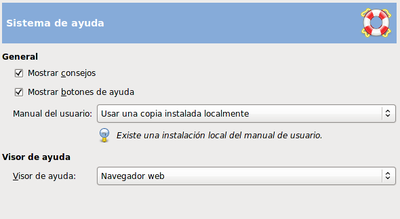 Permite configurar la muestra de los consejos en cada ventana que utilizamos. Puedes activar esa muestra y que aparezca el botón Ayuda o no aparezca en cada una de las ventanas que se abre. Es conveniente desactivar Mostrar consejo al inicio y Mostrar botones de ayuda si no tenemos instalada ninguna ayuda. En caso de que tengamos instalada alguna versión de Ayuda de GIMP podemos elegir el programa con el que se abrirá esa ayuda, bien el Navegador web que tengamos instalado por defecto o un visualizador de ayuda exclusivo de GIMP.