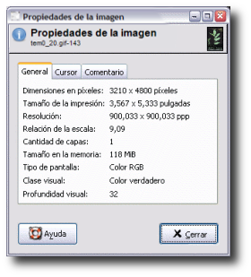 Si accedemos al menú Imagen --> Propiedades de la imagen de la barra de menús de la Ventana Imagen podremos comprobar los siguientes datos, que se corresponden con los que hemos puesto al escanear. Vemos que el tamaño de impresión sigue siendo el original que teníamos (9x13,5 cm) y que la resolución es de 900 ppp, suficientes para que al imprimir nuestra imagen obtengamos una copia en tamaño A3.