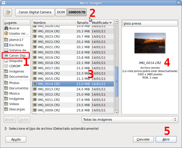 Localizamos el archivo que queremos abrir con Gimp -3 y 4- y hacemos clic en Abrir -5-. A partir de ese momento ya tenemos la imagen en nuestro programa Gimp y podemos trabajar sobre ella. Después debemos guardar la imagen en nuestro disco duro, no es aconsejable guardar una imagen modificada con Gimp en la tarjeta o en la cámara.