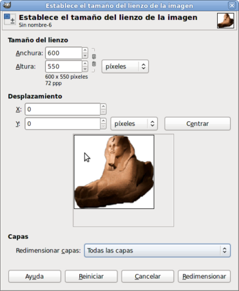 - Para poder situar de forma más adecuada la sombra vamos a ampliar el tamaño del lienzo sobre el que estamos trabajando. Imagen --> Tamaño del lienzo, 600 píxeles de ancho por 550 píxeles de altura y coloca el lienzo primitivo en la posición que se observa: