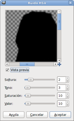 - Nos metemos de lleno con la sombra. Selecciona la capa "Sombra de figura" y haz invisible la capa "Figura". Los bordes de la sombra parecen un poco artificiales, vamos a darles un aspecto más real con un filtro (primero desactiva la opción Bloquear transparencia que tenías activada anteriormente). Filtros --> Ruido --> Ruido HSV con los valores que vienen por defecto.
