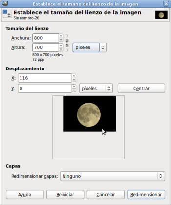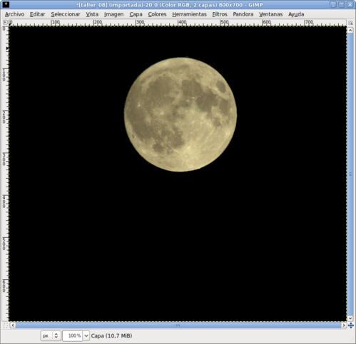 - Vemos ahora que la capa de fondo queda incluida en un lienzo de mayor tamaño. Renombra la capa de fondo como "Capa luna" y crea una nueva capa (la llamarás "fondo"), que se situará encima de ella. Ahora debes colocar la "Capa luna" encima de la nueva. Añade un Canal alfa a la "Capa luna".