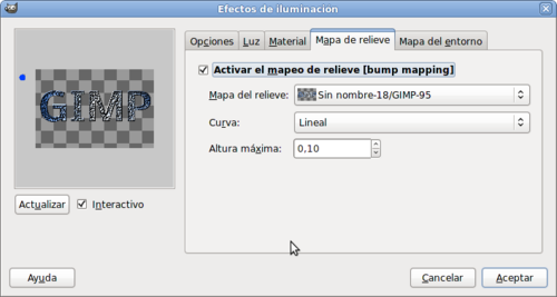 - Aplica el Filtro Mapa --> Mapa de relieve sobre la capa inferior que contiene texto; aumentando el valor profundidad a 5. Coloca esta capa en la parte superior de la pila de capas y pon el modo de combinación Diferencia.