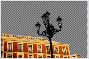 - Ya tienes el cielo completamente seleccionado. A continuación vas a realizar la selección inversa (seleccionando el edificio) para poder trabajar posteriormente con ella. Copia esta selección y crea una nueva capa con el contenido. Llama a la capa que acabas de crear "edificio". Si ocultas las otras dos capas el resultado que tienes es: