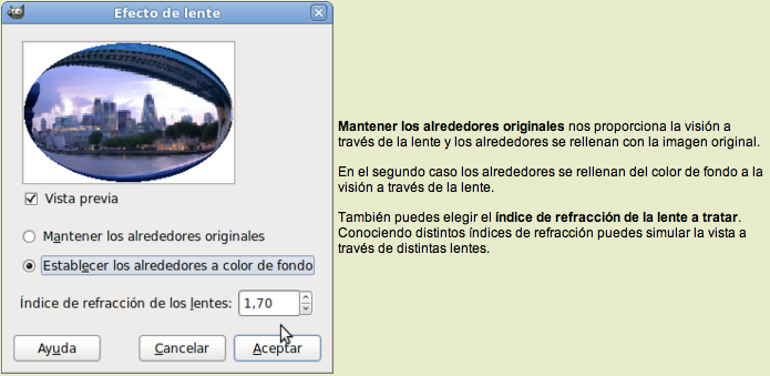 Abre el filtro Aplicar lentes y pon un Índice de refracción de 1,80. Acepta.