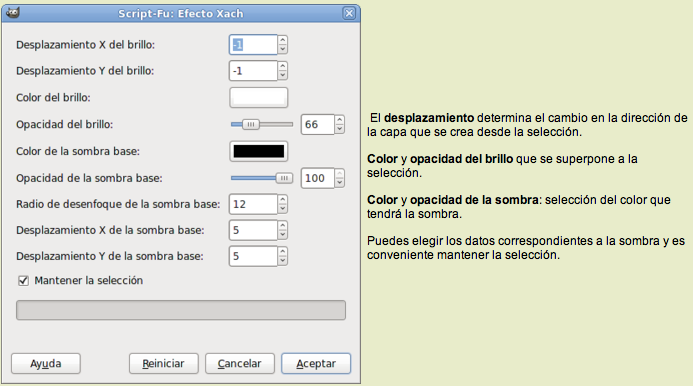 Es un efecto tridimensional aplicado sobre una selección activa que crea una sombra en la imagen, por lo que podemos utilizar también este filtro para obtener sombras sobre selecciones. Tiene un cuadro de diálogo bastante completo.
