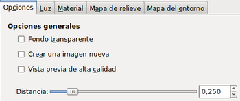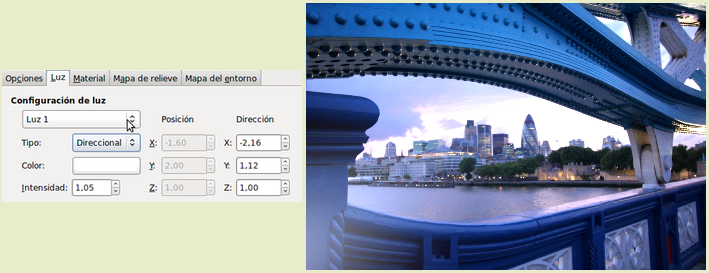 La pestaña Luz nos permite elegir el tipo de luz con el que iluminar nuestra imagen: Ninguno: no utiliza luz. Direccional, el punto de luz tiene una dirección controlada en horizontal (X e Y) y altura (Z). Punto, iluminación puntual como si la fuente de luz fuera una bombilla.