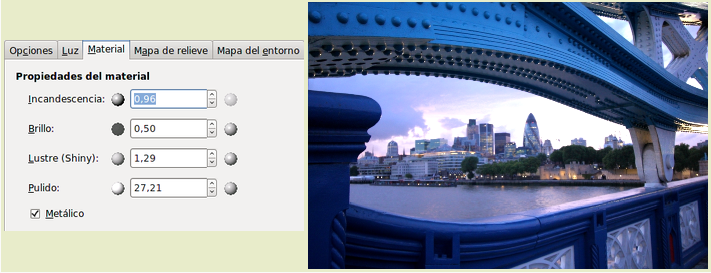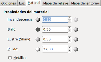 La pestaña Material nos permite modificar las condiciones de la iluminación en cuanto a las características del material que ilumina: Incandescencia, Brillo, Lustre y Pulido.