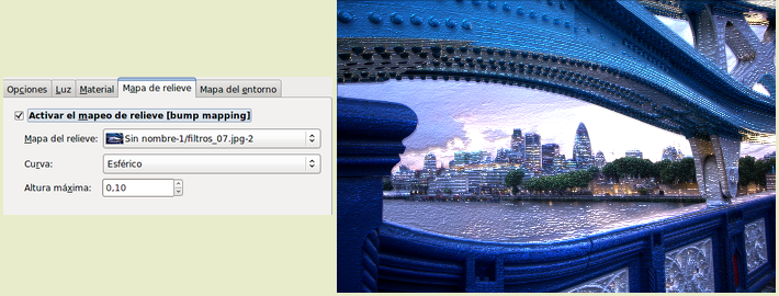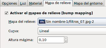 Tiene cuatro tipos de Curva para obtener ese relieve: Lineal, Logarítmico, Sinusoidal y Esférico. Podemos controlar la altura máxima del relieve. No es recomendable poner una altura excesiva, los valores comprendidos entre 0,05 y 0,15 dan muy buenos resultados.