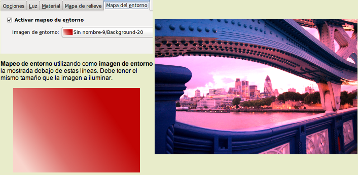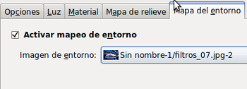 Si activas enla pestaña Mapa del entorno la opción mapeo de entorno, puedes elegir una de las imágenes abiertas en ese momento en GIMP para iluminar el ambiente con esa imagen. Si la imagen es de color sólido nos coloreará toda la imagen con ese color. Los efectos más espectaculares se consiguen con imágenes que tengan un relleno degradado.