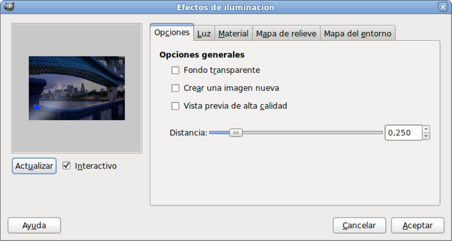 Opciones generales del efecto que permiten elegir un fondo transparente para observar la situación de nuestros puntos de luz; creación de una nueva imagen para preservar la imagen sobre la que actuamos y vista previa de calidad para mejorar la imagen previa que se observa en la parte izquierda de la ventana y, por último, la Distancia que nos permite mover el foco de luz para aumentar o disminuir su intensidad.