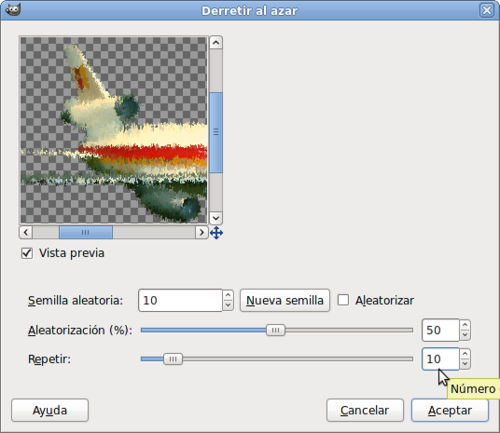 También añade ruido de forma aleatoria, consiguiendo la sensación de que una parte de la imagen se derrite. El cuadro de diálogo es similar al anterior.