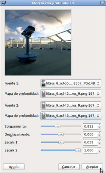 Desde la ventana imagen de "filtros_8.jpg" accede al filtro Combinar --> Mezcla con profundidad y elige los parámetros que puedes ver en la ventana: