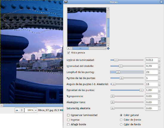Las zonas más brillantes de la imagen sirven para crear estrellas. En su cuadro de diálogo encontramos muchísimas posibilidades de elección de las chispas o motas a colocar en nuestra imagen. Es conveniente realizar una selección de la imagen para aplicar el filtro solamente en aquellas zonas de la imagen que nos interese: