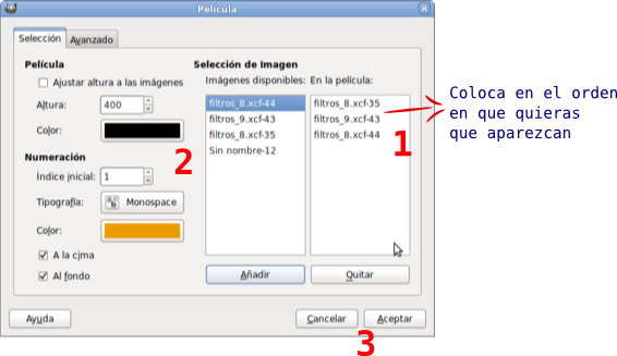 Coloca las imágenes en el orden en que quieres que te aparezcan tras la aplicación del filtro (1). Si te equivocas en el orden debes seleccionar el nombre de la imagen y presionar en el botón Quitar.