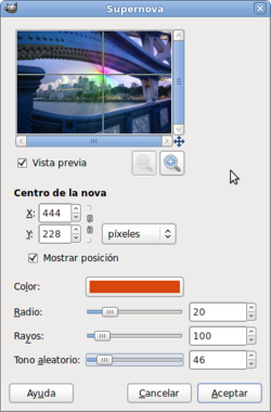 Este un filtro que coloca una estrella en el lugar que queramos de una imagen. Puedes modificar diferentes aspectos de esta estrella, desde el radio hasta el número de rayos que va a mostrar o el tono de los mismos. El color de la supernova también es a nuestra elección.
