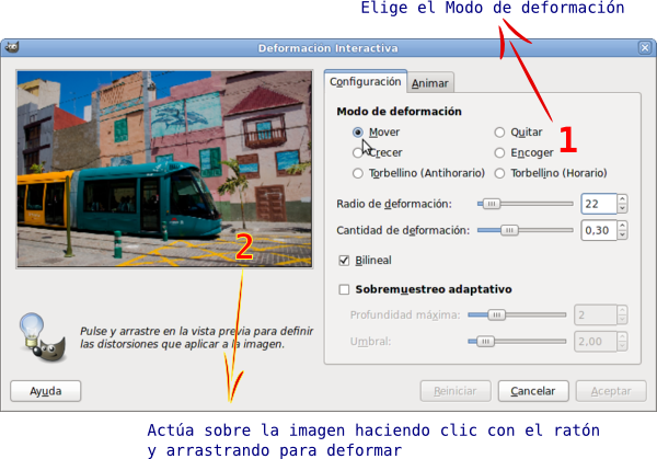 Abre, si no lo has hecho, la imagen "filtros_6.jpg" y aplica sobre ella el filtro de Distorsiones --> IWarp (Distorsión interactiva), con un Radio de deformación de 22 y una Cantidad de deformación de 0,30. Deforma la parte inferior de la fotografía utilizando el Modo de deformación que consideres más adecuado. En la imagen siguiente se ha utilizado el modo Mover y Torbellino.