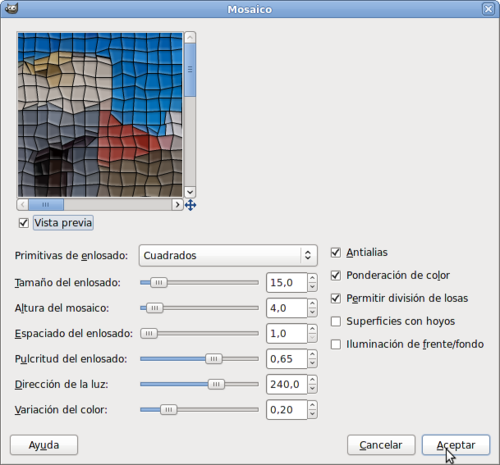 Distorsiones --> Mosaico. Realiza un Mosaico con forma cuadrada sobre la imagen "filtros_6.jpg".
