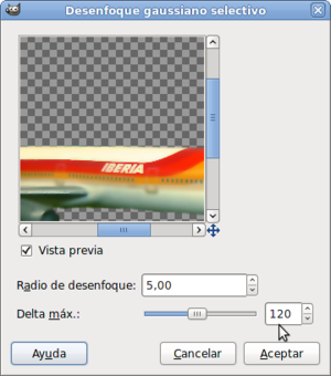 Puedes elegir, además del radio de desenfoque, la gama de colores sobre la que actúa, siendo el mínimo 0 y el máximo 255 (Delta máx). Aplica este desenfoque sobre la capa del avión, con un radio de 5 y un Delta máx de 64.