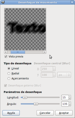 - Accede al menú Filtros --> Desenfoque --> Desenfoque de movimiento, con los siguientes parámetros: 15 en longitud y 135 para el ángulo. Acepta.