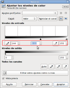 - Haz de nuevo invisible la capa de texto y selecciona la capa que hemos combinado con el fondo y que ahora se llama "Fondo". Haz clic con el botón derecho sobre la imagen y elige el menú Colores --> Niveles. Esta herramienta permite disminuir el número de grises que tiene una imagen. En la ventana Niveles elige los valores que se muestran en la imagen: