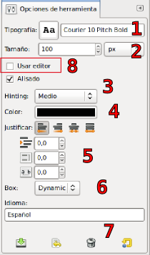Al quedar seleccionada la herramienta Texto en la Caja de herramientas aparecen, en la parte inferior de la misma, las Opciones de herramienta.