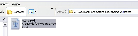 Una vez obtenido el archivo "Nobile-Bold.ttf" debes copiar el archivo y acceder a la carpeta C:/Documents and Settings/Usuario/.gimp-2.x/fonts (siendo x la versión de GIMP que tengas instalada):
