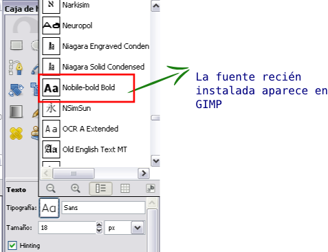 Abre GIMP y accede a la herramienta Texto y busca en las Tipografías para localizar la fuente que acabas de instalar.