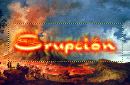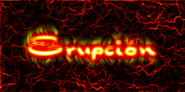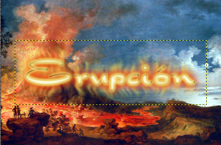 Abre la imagen "erupcion.jpg" en GIMP y en la imagen del fuego mezcla las capas denominadas "texto", "fuego1" y "fuego2". Arrastra sobre la imagen "erupcion.jpg" esta última capa para obtener el siguiente resultado.