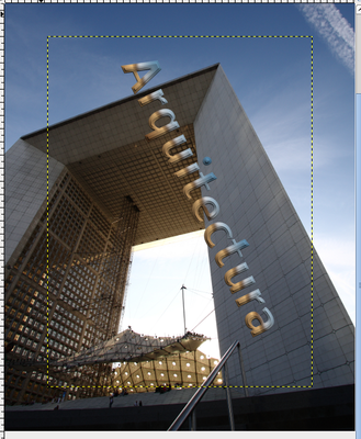 - Mueve la capa hasta situarla a la derecha del edificio. Modifica la perspectiva de la capa para que coincida con la del edificio utilizando la herramienta Perspectiva