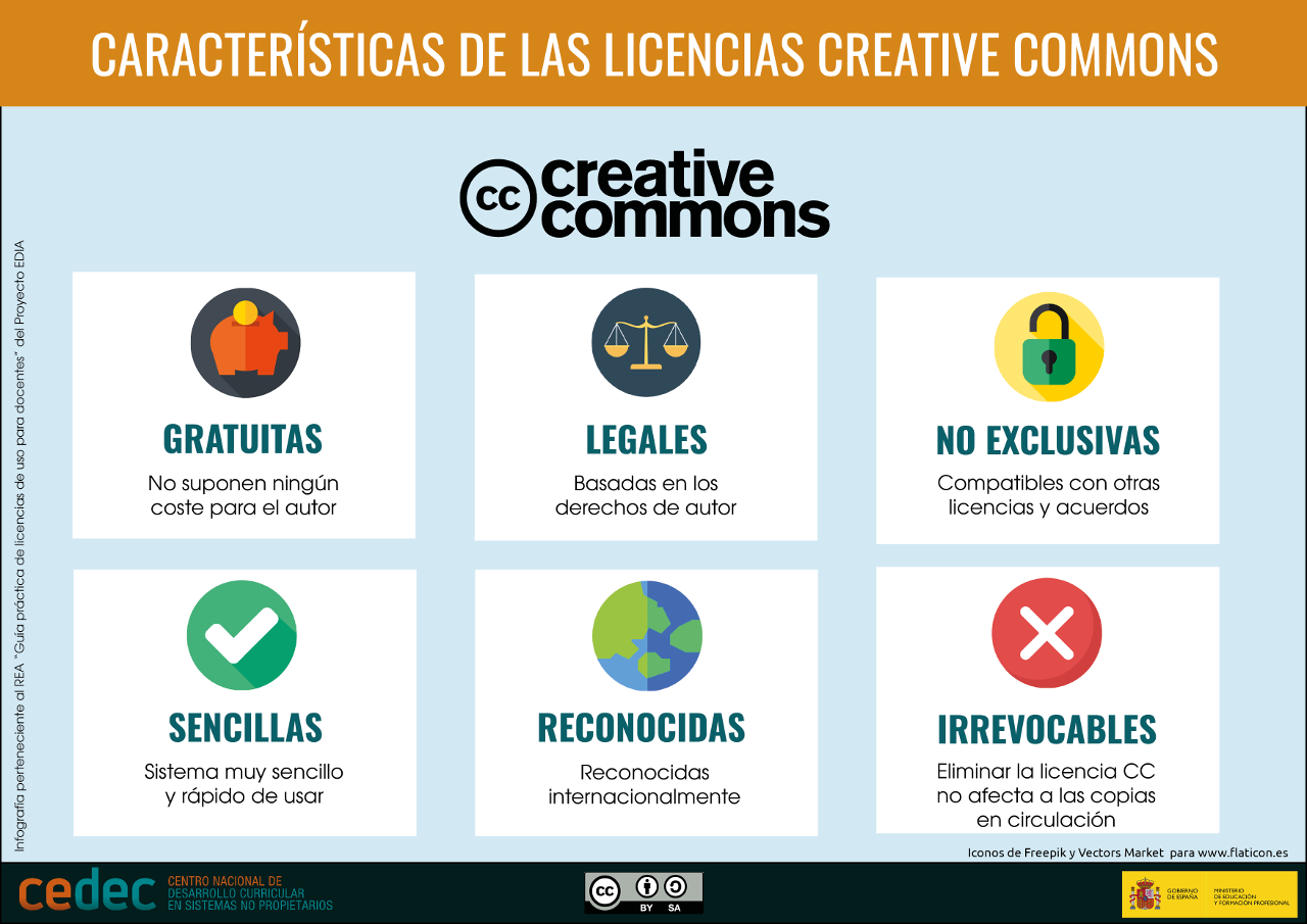As licenzas Creative Commons (CC) son un sistema moi sinxelo que nos permite compartir o noso material con outros usuarios sen necesidade de que teñan que solicitar permiso nin pagar por iso. Coa simple inclusión dunha destas licenzas nunha obra, o autor dá permiso a calquera usuario a utilizala baixo as condicións da licenza concreta. Por tanto cando un usuario atopa un material licenciado con CC sabe que pode usalo de forma legal e gratuíta sen necesidade de solicitar permiso, sempre que cumpra as condicións indicadas.