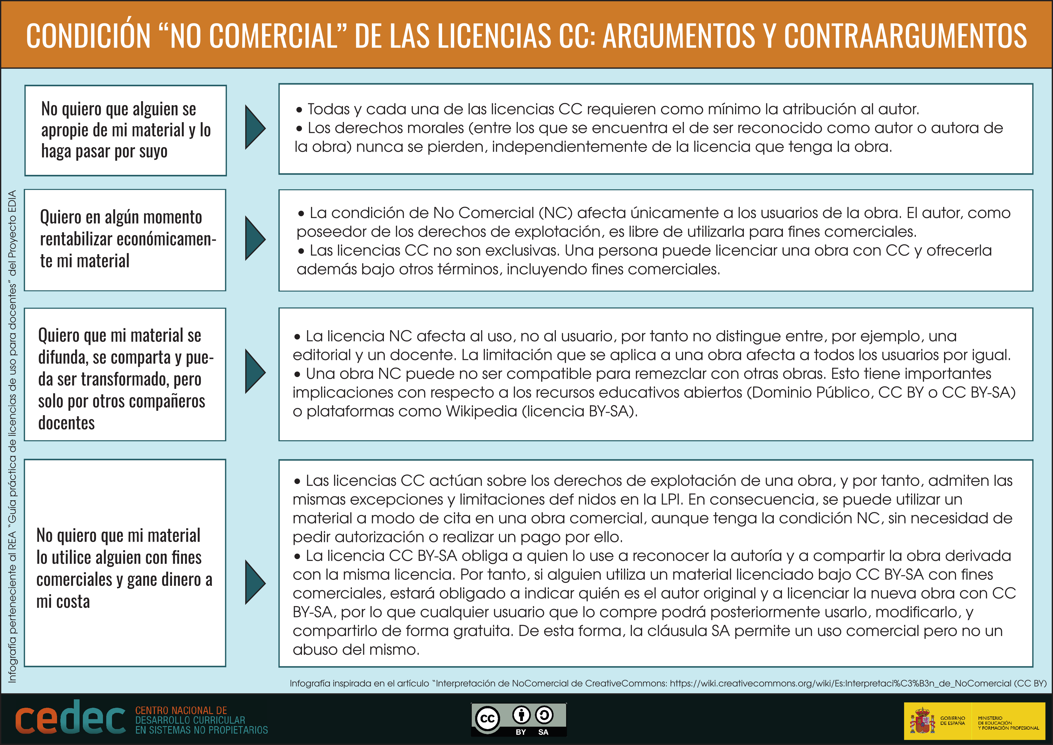 A continuación expomos unha infografía con algunhas aclaracións que nos poden axudar a comprender esta condición e as súas implicacións, explicadas como resposta ás razóns habituais polas que os usuarios elixen esta condición de NC, creada a partir do artigo Interpretación de Non Comercial, de Creative Commons, 2017.